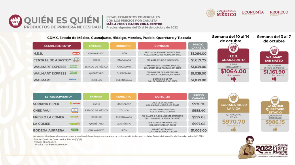 En la lista presentada el lunes 24 de octubre de 2022, de la Profeco “Quién es Quién en los Precios”, el precio más bajo de la Canasta Alimentaria para la zona centro (CDMX, Estado de México, Guanajuato, Hidalgo, Morelos, Puebla, Querétaro y Tlaxcala) se estableció en $986.15 (La Comer Querétaro Estadio), de acuerdo al este estudio con $63,830.00 se podría alimentar a 65 familias.