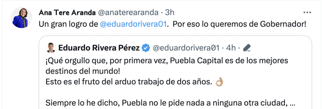 Como cuando también se inventaron que gracias a Rivera Pérez y su equipo, Puebla —ciudad y Estado— destacó en los Premios Travellers´ Choice de TripAdvisor, donde viajeros de todo el mundo opinan y califican sus aventuras durante un período de 12 meses.