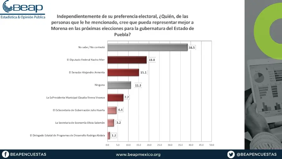 38.5% dijo que no sabe o no contestó la pregunta. Después, 18.8% dijo que el Diputado Federal Nacho Mier. Un 15.1% dijo que el Senador Alejandro Armenta. 11.3 % dijo que “Ninguno”. 7.7% dijo que la ex Alcaldesa Claudia Rivera Vivanco. 4.4% dijo que el ex Secretario de Gobernación Julio Huerta. 3.2% dijo que la Secretaria de Economía Olivia Salomón y solo 1.2% dijo que el Delegado Federal Rodrigo Abdala.