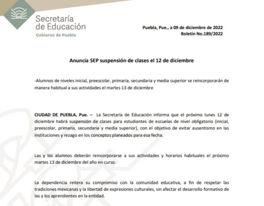 Aunque no está considerado como día feriado en el calendario escolar 2022-2023, el 12 de diciembre no habrá clases en los planteles educativos de Puebla.