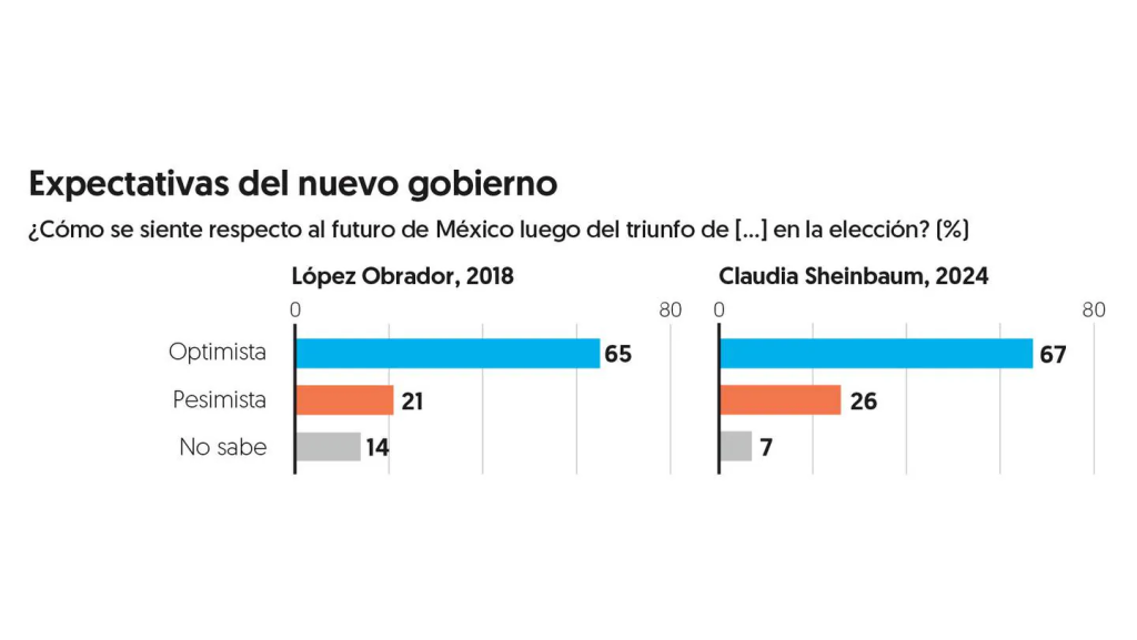 En un ejercicio similar realizado hace seis años, 65 por ciento dijo sentirse optimista luego del triunfo de Andrés Manuel López Obrador en las elecciones, mientras que 21 por ciento se sentía pesimista.