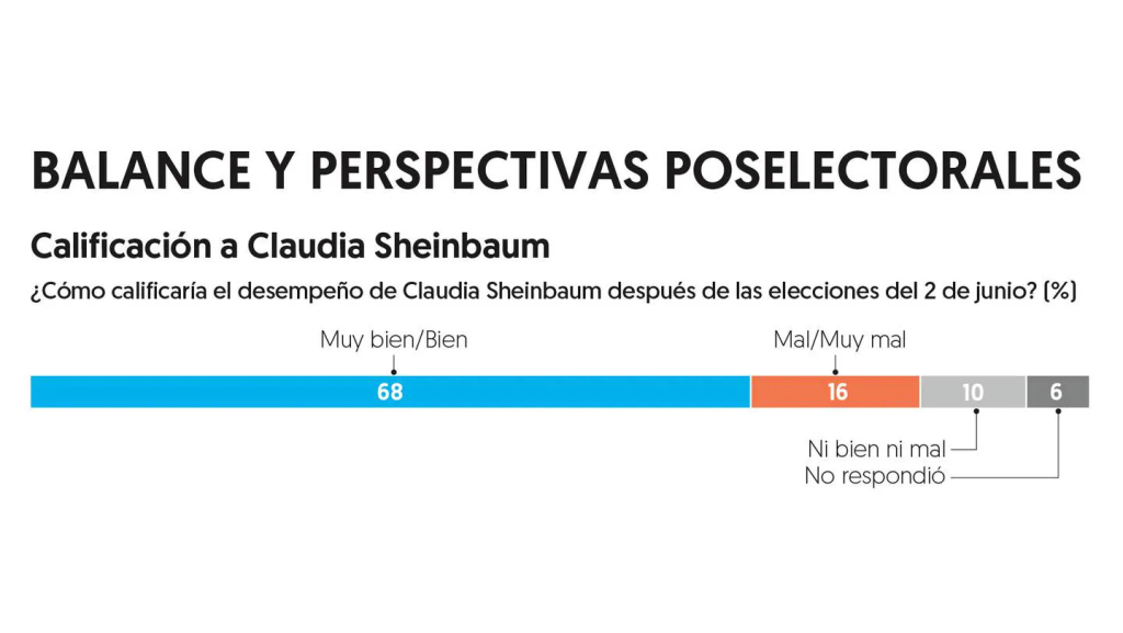 Al preguntar cómo califican el desempeño de Claudia Sheinbaum después de las elecciones del 2 de junio, 68 por ciento respondió que “muy bien” o “bien”, mientras que 16 por ciento señaló que “mal” o “muy mal”.