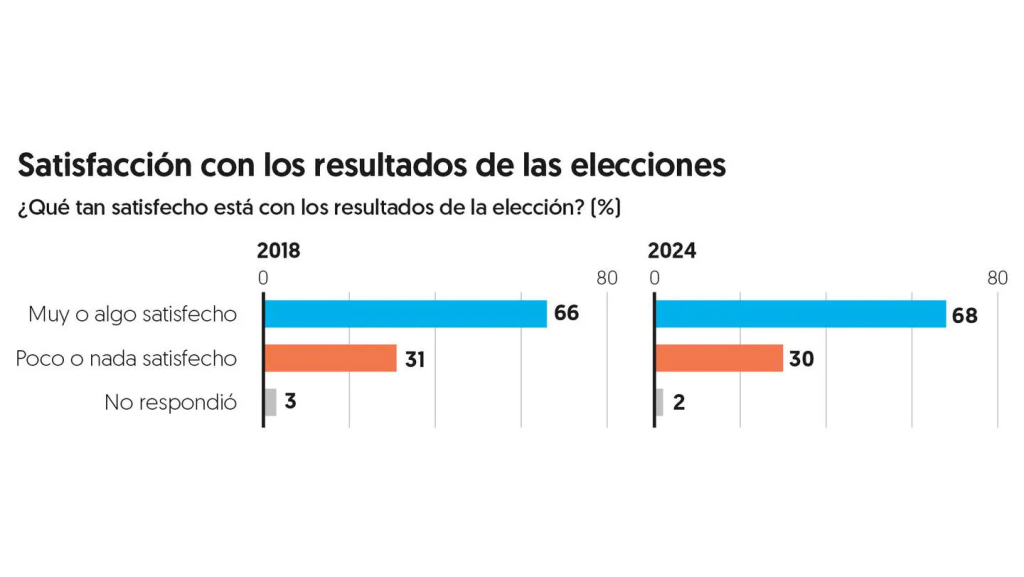 De acuerdo con el estudio, la opinión mayoritaria sobre el proceso electoral es favorable: 68 por ciento se dijo muy o algo satisfecho con el resultado de la elección, comparado con 66 por ciento hace seis años; mientras que 30 por ciento se dijo poco o nada satisfecho con el resultado.