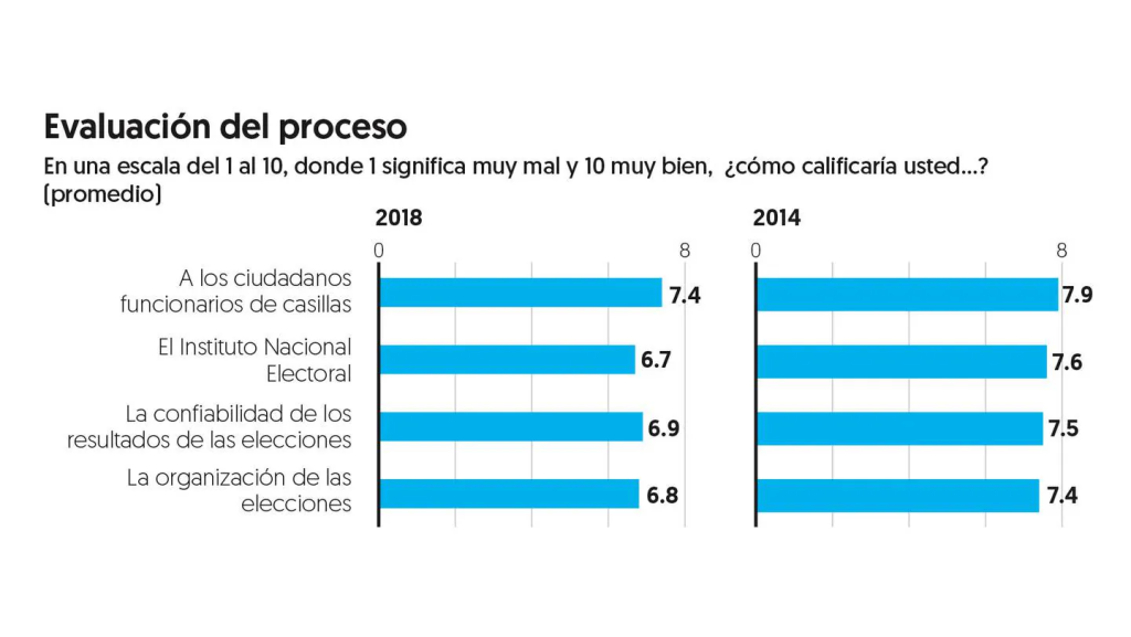 Al INE se le calificó con 7.6; la confiabilidad de los resultados electorales obtuvo 7.5, y la organización de las elecciones, 7.4, aspectos que habían obtenido menos de 7 en los comicios presidenciales anteriores.