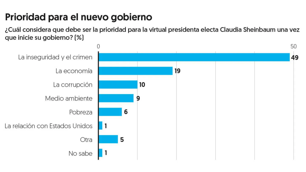 Al preguntar cuál debería ser la prioridad del nuevo gobierno de Claudia Sheinbaum, 49 por ciento de las personas consultadas mencionó la inseguridad y el crimen; 19 por ciento, la economía; 10 por ciento, la corrupción; 9 por ciento, el medio ambiente; 6 por ciento, la pobreza, y 1 por ciento, la relación con Estados Unidos.