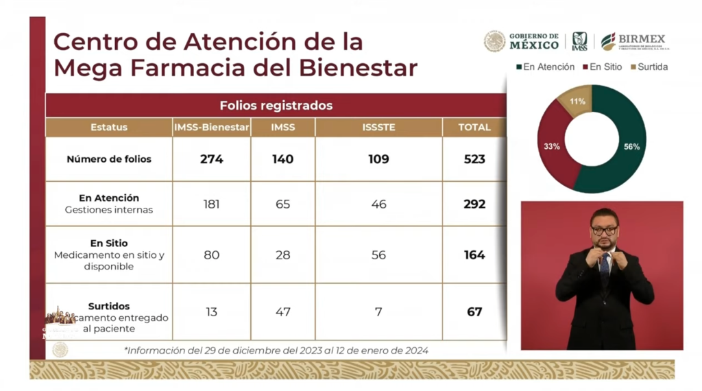 El titular de Birmex explicó que se atendieron un total de 523 folios, de los cuales 292 se encuentran en atención, en 164 el fármaco se encuentra en sitio y disponible y únicamente 67 fármacos ya fueron surtidos o entregados al paciente.