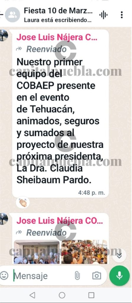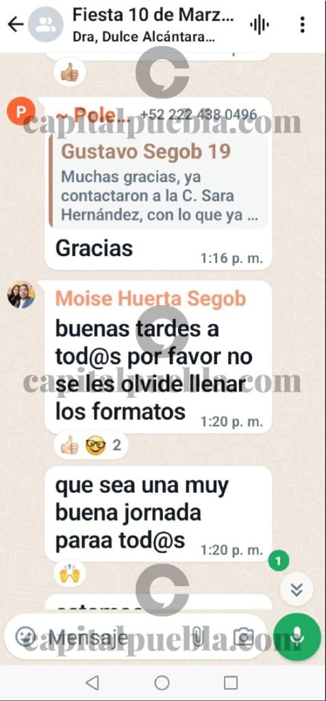 Junto a Laura Sánchez de la Segob, crearon un grupo de WhatsApp y lo llamaron «Fiesta 10 de marzo». En éste convocaron a la gente que trabaja en los Colegios para asistir al evento de la Dra. Claudia Sheinbaum en Tehuacán.