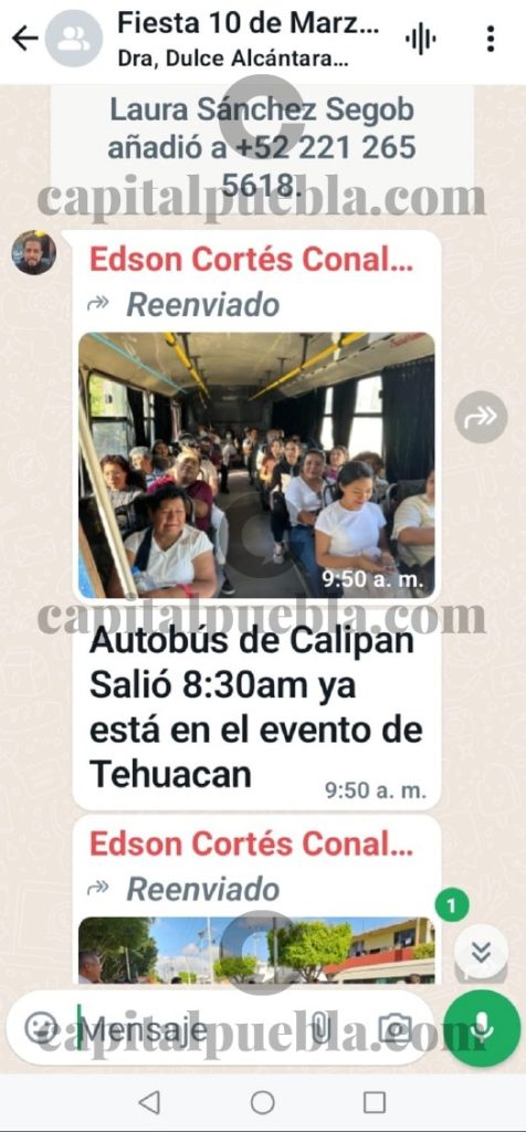 Lo mismo aplicó Edson al reenviar un texto acompañado de algunas fotografías: «Autobús de Calipan Salió 8:30am ya está en el evento de Tehuacan».