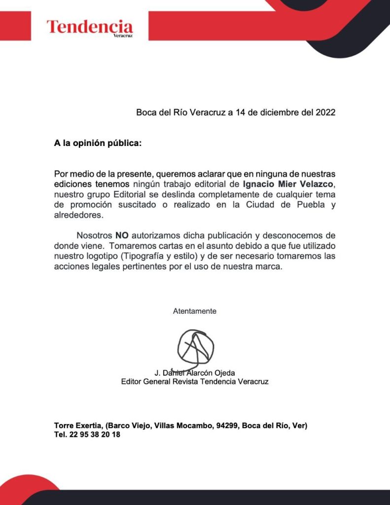 Firmado por Daniel Alarcón Ojeda, que se ostenta como editor general de Tendencia Veracruz, el documento indica que jamás realizaron alguna entrevista a Mier Velazco, mucho menos un trabajo de cobertura periodística en Puebla.